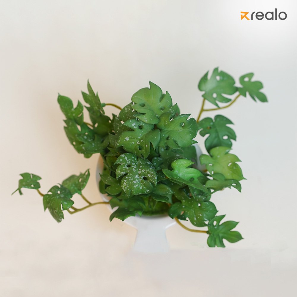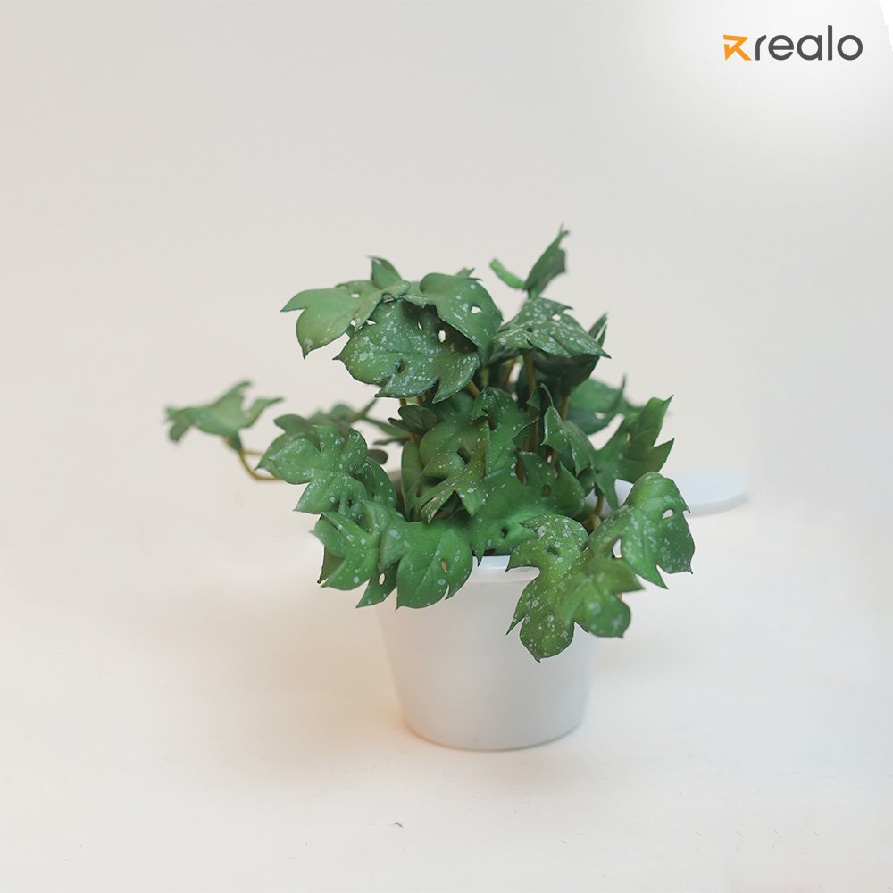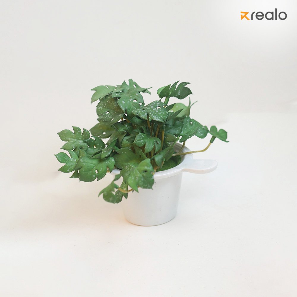 The image showcases a vibrant green plant with distinct, jagged leaves and visible water droplets, giving it a fresh and lively appearance. The plant appears to be sprouting from a small, white plastic yogurt cup, with the cup’s lid slightly peeled back, creating a playful and creative illusion. The background is a neutral, off-white shade, allowing the greenery to stand out. The branding “Realo” is positioned in the top right corner, suggesting that the image might be part of a promotional or artistic project. The combination of an everyday disposable item with natural elements conveys a message of sustainability, creativity, or repurposing objects in unique ways.
